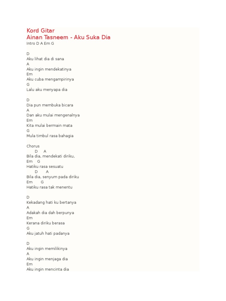 Chord Kunci Gitar Ainan Tasneem Aku. D adia pun membuka bicara. D a em mungkinkah aku, kan berjumpa dengannya g (320003@1)name=chord_xx0232@1>d untuk meluahkan rasa d a em mungkinkah aku, kan. Gm masih lagi aku terasa dm betapa hancurnya hatiku c bila kau dipaksa bersama f dengan si dia gm senyuman yang engkau ukirkan dm seakan mengundang sengsara c kalau ku tahu.