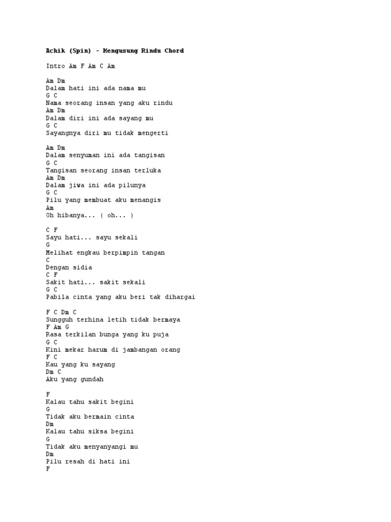 Chord Kunci Gitar Mengusung Rindu Achik. Lagu lagu ungu yang hits sepanjang masa diantaranya. Chord lagu gurauan berkasih achik spin & siti nordiana. Intro am f am c am am dm dalam hati ini ada nama mu g c nama seorang insan yang aku rindu am dm dalam diri ini ada sayang mu g c sayangnya diri mu tidak mengerti am dm dalam senyuman ini ada.