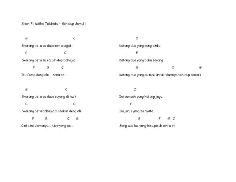 Berikut kami sajikan untuk anda daftar lagu, lirik dan chord mitha talahatu terlengkap. Kumpulan chord kunci gitar dasar. Rated 3.3/5 by 3 users. Am setia akan ku jaga. 10 chord kunci gitar wali paling banyak dicari. F satu hati sampai mati g am setia tak terganti. Masihkah ada cinta deng sayang yang tahan di dalam dada mungkinkah su seng ada rindu untuk saling memiliki beta minta satu dar ale jangan pernah ini terjadi. Lagu yang menjadi salah satu singel mitha talahatu ini dirilis pada 2020 melalui kanal youtube pelita utama. Lirik lagu terlalu cinta mitha talahatu.
