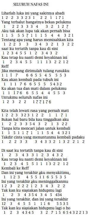 Kumpulan lirik lagu dan not angka lagu, lagu indonesia, barat, lagu daerah. Not angka lirik lagu dan video cherry belle dilema. Selain liriknya yang sangat menyentuh, lagu ini juga cukup mudah dihafal dan dimainkan dengan berbagai alat musik, khususnya pianika dan piano. Dalam lagu yang terlihat menyenangkan dan enerjik tersebut, sebenarnya memiliki sebuah makna dan cerita yang terkandung di dalamnya yang dibagi dalam 5 makna. Namun, di akhir lirik tersebut kita dapat mengetahui arti dari lagu tersebut. Kumpulan not angka pianika lagu terbaru. Kami hanya diberikan naskah lirik lagu dan not angka dengan bertuliskan lagu syukur oleh hs.mutahar. Jika masih ada yang belum tahu not angka dan lirik lagu apuse bisa lihat liriknya di bawah ini. Rikuesan selanjutnya merupakan lagu dari penyanyi vocaloid terkenal bernama gumi, dengan judul kokoronashi.