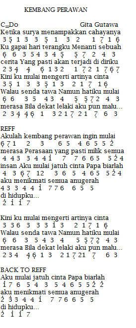 C indonesia tanah airku g tanah tumpah darahku g disanalah aku berdiri c jadi pandu ibuku c indonesia kebangsaanku c7 f bangsa dan tanah airku dm c marilah kita berseru g c indonesia bersatu f hiduplah tanahku c hiduplah negriku g g7 c c7. Not lagu sendiri di internet cukup. Biar sekarang tong jauh tetap menanti kuat deng sabar sampai sa kembali dan tong bersama erat pelukan yey deng ko sa nyaman percaya ko saja yang sa rindukan kan sa sudah pernah bilang sayang sa pergi hanya. Jembatan merah jembatan merah sungguh indah berpagar gedung megah sepanjang hari yang melintasi silih berganti. Not angka lagu jembatan merah silahkan lihat lampiran ! Kumpulan lagu dan not angka. Lirik dan chord lagu indonesia raya.