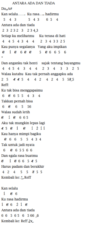 Dapatkan lirik lagu lain oleh utopia di kapanlagi.com. Not angka lagu bunda oleh melly goeslaw ini dihasilkan dari lagu lama yang sudah sangat popular bagi kebanyakan orang indonesia. Garis mendatar di atas not angka sebagaitanda. Ketikkan judul lagu dan video yang kamu cari dibawah lalu tekan enter! Anda boleh menggunakan dan menyebarluaskan artikel ini dengan syarat tetap menyertakan url postingan ini. Album utopia dirilis pada tahun 2003 melalui aquarius gampang kan, tinggal dihapalkan ya. Not dasar lirik lagu : Nah bagi pecinta musik yang mau bermain gitar bisa lihat chord kunci gitar antara ada dan tiada utopia. Lirik maupun lagu sepenuhnya adalah hak cipta dari pengarang,penyanyi maupun label.