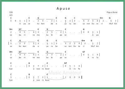 Not Angka Lagu Apuse. Lagu apuse merupakan lagu dari daerah biak, namun masih belum diketahui sampai sekarang siapa pencipta dari lagu ini. Juga ada lirik lagu apuse dan terjemahannya. Teluk doreri pernah menjadi pelabuhan penting di daerah papua, hal ini terbukti dari banyaknya kapal karam di daerah tersebut.