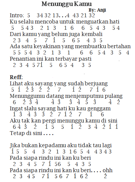 Kesepian hati ini bersamaku membunuh jiwaku semua daya tlah ku coba melabuhkan hatiku ini. Engkaulah nafasku yang menjaga di dalam hidupku kau ajarkan aku menjadi yang terbaik. Jujur saja ku tak mampu hilangkan wajahmu di hatiku meski malam mengganggu hilangkan senyummu di mataku ku sadari aku cinta padamu. Daftar isi1 daftar not angka lagu wajib nasional1.1 not angka indonesia raya1.2 not angka mengheningkan cipta1.3 not angka tanah airku1.4 not pianika hymne guru1.5 not 1.10 not lagu padamu negeri.