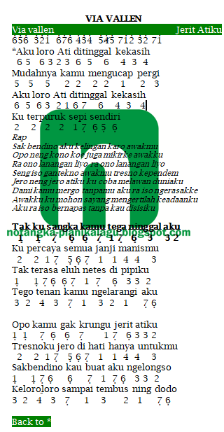 Not Angka Lagu Via Vallen Selingkuh. Lirik not angka lagu selingkuh. Iki ati du parkiran maju mundur ra karuan iki ati du layangan tarik ulur sembarangan nanging tresno. Berikut ini adalah lirik dari lagu pikir keri ya gan.