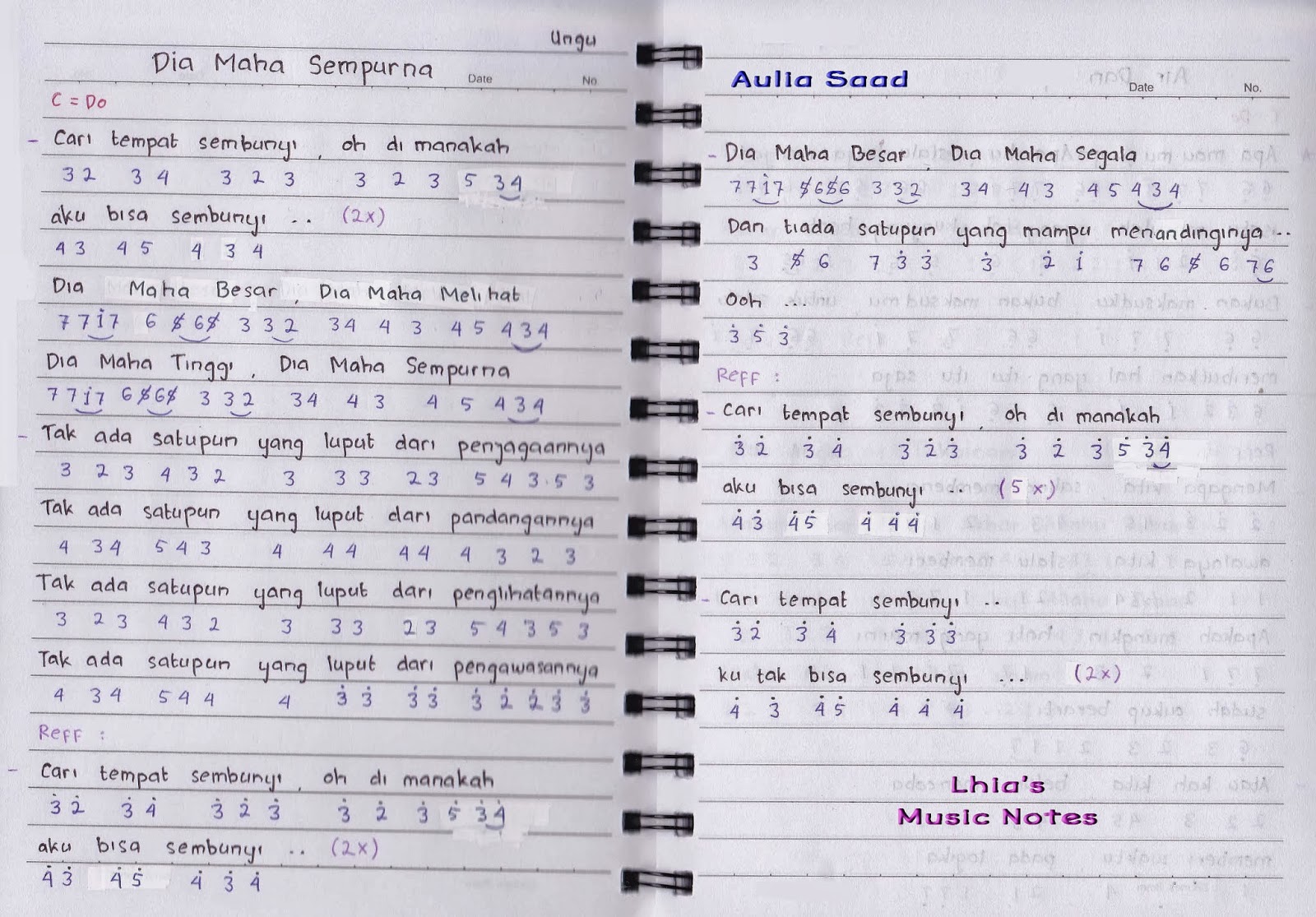 Not Angka Pianika Dia Maha Sempurna Ungu. Not balok dan not angka lagu pop untuk pianika, piano, keyboard. Titik bawah (rendah), titik atas (tinggi). Not pianika dia maha sempurna, not angka dia.