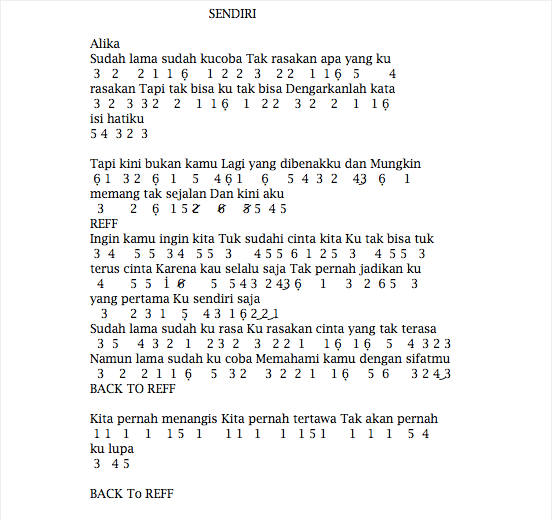 Not Angka Pianika Kamu Ngga Sendirian Menyajikan not angka lagu pianika, not angka lagu piano, not angka lagu suling, not angka lagu gitar, not angka lagu recorder, dan lirik lagu.