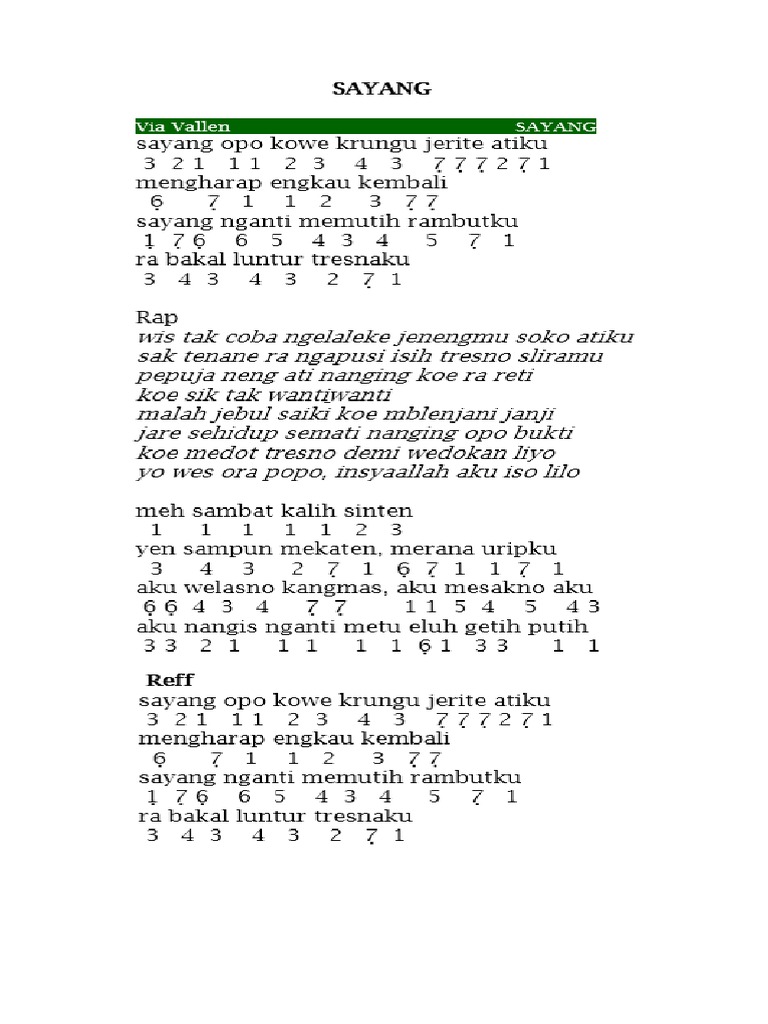 Sayang sayang opo kowe krungu jerite atiku sayang, apa kamu mendengar jeritan hatiku. Not angka dari lagu via vallen berjudul sayang dapat dilihat pada lampiran. Chord lagu sayang (new version) via vallen. Yen kowe gelem tak sayang ya ojo mbok gawe bimbang ra sah kakehen alesan.